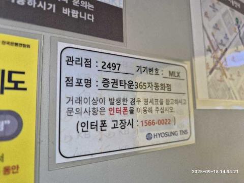 코너명: (목)증권타운 365자동화점 작업일: 2025-09-18청소형태: (목)입점회차: 1회차작업확인: 미확인전송: 대기사진수: 4시작시간: 1434마침시간: 1437 3번 읽음