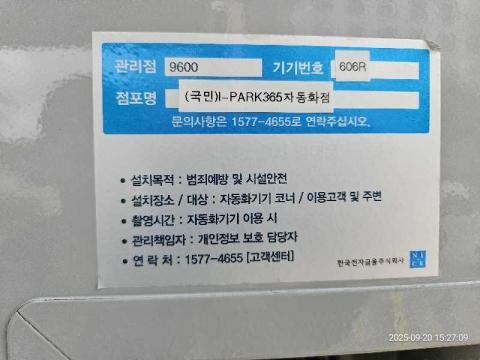 코너명: (국민)I-PARK365자동화점작업일: 2025-09-20청소형태: 간이청소회차: 3회차작업확인: 미확인전송: 대기사진수: 14시작시간: 1527마침시간: 1528 5번 읽음