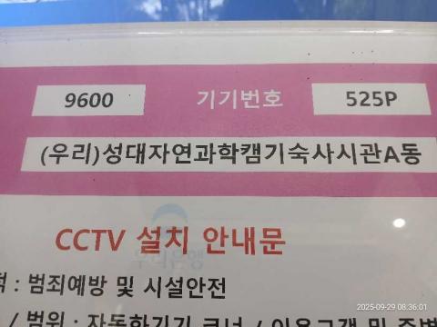 코너명: (우리)성대자연과학캠기숙사신관A동작업일: 2025-09-29청소형태: 간이청소회차: 5회차작업확인: 미확인전송: 대기사진수: 3시작시간: 0833마침시간: 0839 5번 읽음