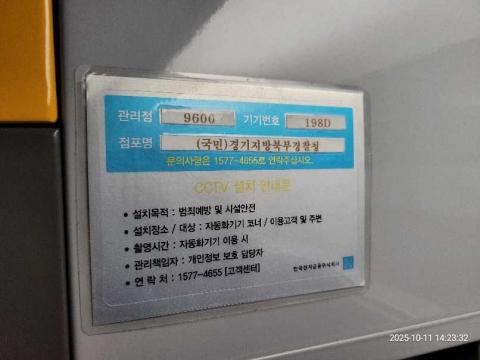 코너명: (국민)경기지방북부경찰청작업일: 2025-10-11청소형태: 대청소회차: 1회차작업확인: 미확인전송: 완료전송메시지: {"resultCd":"1","resultMsg":"정상 처리 되었습니다."}사진수: 11시작시간: 1423마침시간: 1428