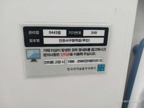 코너명: 인천서구청역점(무인)작업일: 2025-10-11청소형태: 대청소회차: 2회차작업확인: 미확인전송: 완료전송메시지: {"resultCd":"1","resultMsg":"정상 처리 되었습니다."}사진수: 22시작시간: 1553마침시간: 1643