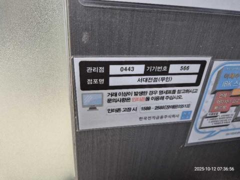 코너명: 서대전점(무인)작업일: 2025-10-12청소형태: 대청소회차: 1회차작업확인: 미확인전송: 완료전송메시지: {"resultCd":"1","resultMsg":"정상 처리 되었습니다."}사진수: 16시작시간: 0736마침시간: 0757