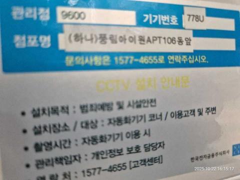 코너명: (하나)풍림아이원APT106동앞작업일: 2025-10-22청소형태: 간이청소회차: 1회차작업확인: 미확인전송: 대기사진수: 3시작시간: 1615마침시간: 1619 5번 읽음