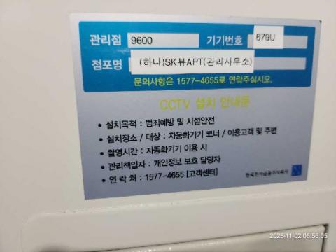 코너명: (하나)SK뷰APT(관리사무소)작업일: 2025-11-02청소형태: 간이청소회차: 1회차작업확인: 미확인전송: 대기사진수: 3시작시간: 0656마침시간: 0658 4번 읽음