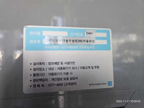 코너명: (국민)건국대충주병원365자동화점작업일: 2025-11-21청소형태: 간이청소회차: 1회차작업확인: 미확인전송: 대기사진수: 4시작시간: 1009마침시간: 1014 3번 읽음