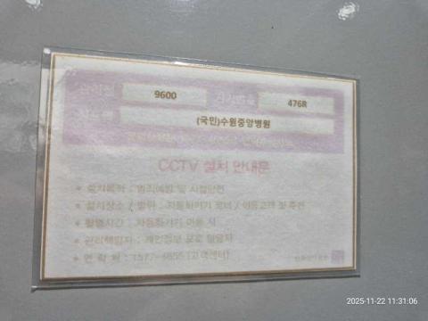 코너명: (국민)수원중앙병원365자동화점작업일: 2025-11-22청소형태: 간이청소회차: 3회차작업확인: 미확인전송: 대기사진수: 2시작시간: 1131마침시간: 1131 3번 읽음
