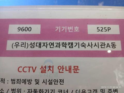 코너명: (우리)성대자연과학캠기숙사신관A동작업일: 2025-11-22청소형태: 간이청소회차: 5회차작업확인: 미확인전송: 대기사진수: 3시작시간: 0802마침시간: 0806 3번 읽음