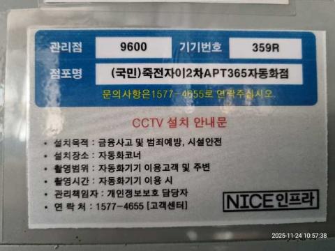 코너명: (국민)죽전자이2차APT365자동화점작업일: 2025-11-24청소형태: 간이청소회차: 1회차작업확인: 미확인전송: 대기사진수: 3시작시간: 1055마침시간: 1100 1번 읽음