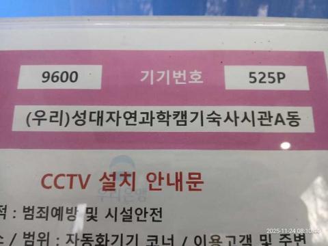 코너명: (우리)성대자연과학캠기숙사신관A동작업일: 2025-11-24청소형태: 간이청소회차: 5회차작업확인: 미확인전송: 대기사진수: 3시작시간: 0809마침시간: 0813 4번 읽음