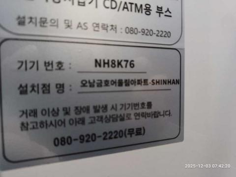 코너명: 오남금호어울림아파트-SHINHAN작업일: 2025-12-03청소형태: 간이청소회차: 1회차작업확인: 미확인전송: 대기사진수: 3시작시간: 0742마침시간: 0748 3번 읽음
