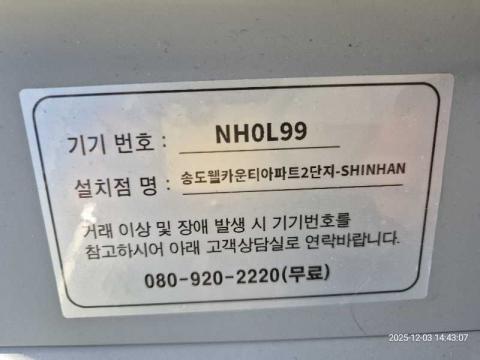 코너명: 송도웰카운티아파트2단지-SHINHAN작업일: 2025-12-03청소형태: 간이청소회차: 1회차작업확인: 미확인전송: 대기사진수: 4시작시간: 1443마침시간: 1446 4번 읽음