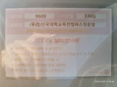 코너명: (우리)단국대학교죽전캠퍼스정문앞작업일: 2025-12-03청소형태: 간이청소회차: 1회차작업확인: 미확인전송: 대기사진수: 3시작시간: 1126마침시간: 1131 3번 읽음