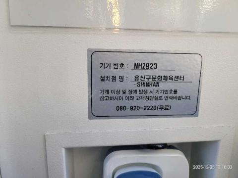 코너명: 용산구문화체육센터-SHINHAN작업일: 2025-12-05청소형태: 간이청소회차: 1회차작업확인: 미확인전송: 대기사진수: 4시작시간: 1316마침시간: 1324 4번 읽음