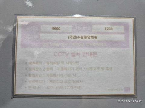 코너명: (국민)수원중앙병원365자동화점작업일: 2025-12-06청소형태: 간이청소회차: 1회차작업확인: 미확인전송: 대기사진수: 2시작시간: 1238마침시간: 1238 3번 읽음