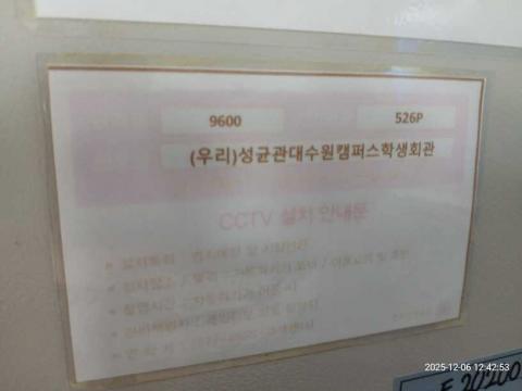 코너명: (우리)성균관대수원캠퍼스학생회관작업일: 2025-12-06청소형태: 간이청소회차: 2회차작업확인: 미확인전송: 대기사진수: 4시작시간: 1242마침시간: 1251 3번 읽음