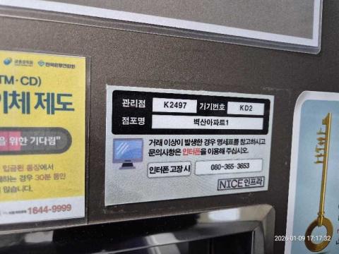코너명: 벽산아파트점작업일: 2026-01-09청소형태: 대청소회차: 1회차작업확인: 미확인전송: 완료전송메시지: {"resultCd":"1","resultMsg":"정상 처리 되었습니다."}사진수: 17시작시간: 1717마침시간: 1736 3번 읽음