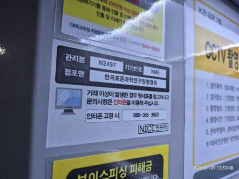 코너명: 한국표준과학연구원행정동작업일: 2026-01-09청소형태: 대청소회차: 1회차작업확인: 미확인전송: 완료전송메시지: {"resultCd":"1","resultMsg":"정상 처리 되었습니다."}사진수: 14시작시간: 1333마침시간: 1340 1번 읽음