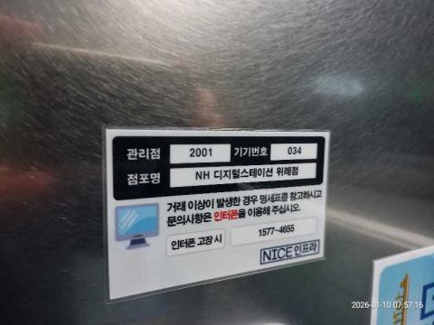 코너명: NH디지털스테이션 위례점작업일: 2026-01-10청소형태: 대청소회차: 1회차작업확인: 미확인전송: 완료전송메시지: {"resultCd":"1","resultMsg":"정상 처리 되었습니다."}사진수: 15시작시간: 0755마침시간: 0810