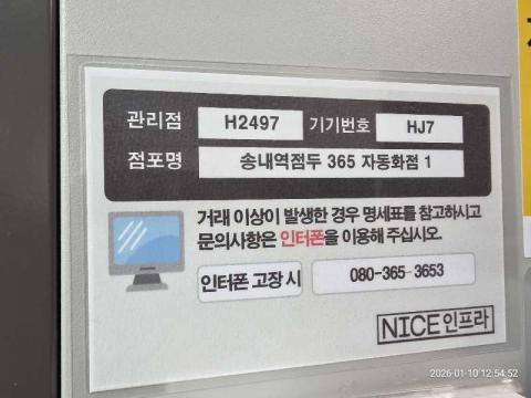 코너명: 송내역점두 365자동화점작업일: 2026-01-10청소형태: 대청소회차: 2회차작업확인: 미확인전송: 완료전송메시지: {"resultCd":"1","resultMsg":"정상 처리 되었습니다."}사진수: 18시작시간: 1254마침시간: 1305 1번 읽음