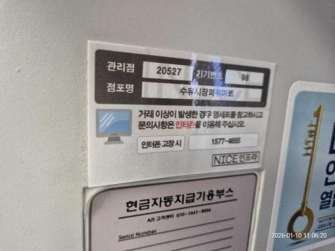 코너명: 수유시장파워마트작업일: 2026-01-10청소형태: 대청소회차: 1회차작업확인: 미확인전송: 완료전송메시지: {"resultCd":"1","resultMsg":"정상 처리 되었습니다."}사진수: 11시작시간: 1106마침시간: 1118 1번 읽음