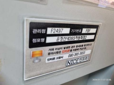 코너명: 운정산내 365자동화점작업일: 2026-01-11청소형태: 대청소회차: 1회차작업확인: 미확인전송: 완료전송메시지: {"resultCd":"1","resultMsg":"정상 처리 되었습니다."}사진수: 20시작시간: 0732마침시간: 0747 1번 읽음