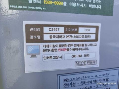 코너명: 동국대학교 본관(365자동화점)작업일: 2026-01-12청소형태: 대청소회차: 1회차작업확인: 미확인전송: 완료전송메시지: {"resultCd":"1","resultMsg":"정상 처리 되었습니다."}사진수: 9시작시간: 1325마침시간: 1330