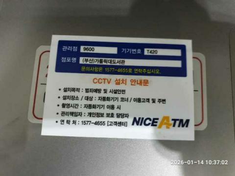 코너명: (부산)가톨릭대도서관작업일: 2026-01-14청소형태: 대청소회차: 1회차작업확인: 미확인전송: 완료전송메시지: {"resultCd":"1","resultMsg":"정상 처리 되었습니다."}사진수: 11시작시간: 1037마침시간: 1037