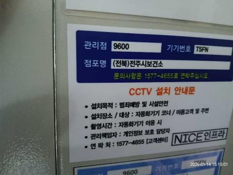 코너명: (전북)전주시보건소작업일: 2026-01-14청소형태: 대청소회차: 1회차작업확인: 미확인전송: 완료전송메시지: {"resultCd":"1","resultMsg":"정상 처리 되었습니다."}사진수: 13시작시간: 1515마침시간: 1515