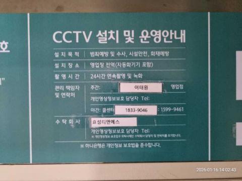 코너명: 구.이태원남작업일: 2026-01-16청소형태: 대청소회차: 1회차작업확인: 미확인전송: 완료전송메시지: SUCCESS_COUNT=(9), ERROR_COUNT=(0), RESULT_CODE=(0), RESULT_MESSAGE=(업로드 성공)사진수: 9시작시간: 1355마침시간: 1402