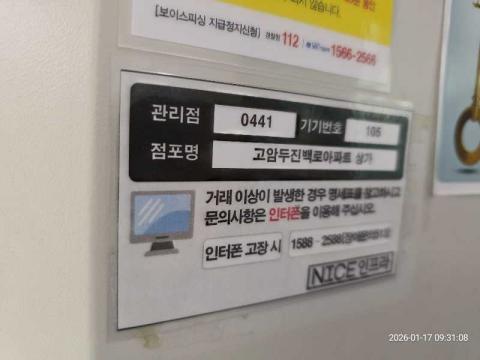 코너명: 고암두진백로아파트 상가작업일: 2026-01-17청소형태: 대청소회차: 1회차작업확인: 미확인전송: 완료전송메시지: {"resultCd":"1","resultMsg":"정상 처리 되었습니다."}사진수: 13시작시간: 0931마침시간: 0944