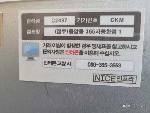 코너명: 종암동 365자동화점작업일: 2026-01-17청소형태: 대청소회차: 1회차작업확인: 미확인전송: 완료전송메시지: {"resultCd":"1","resultMsg":"정상 처리 되었습니다."}사진수: 18시작시간: 1133마침시간: 1152