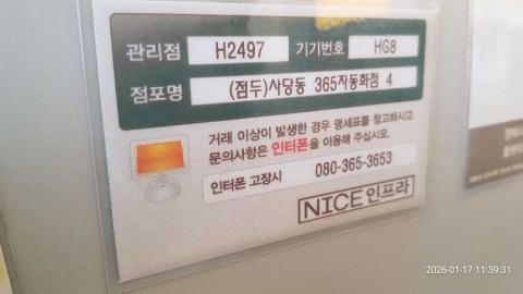 코너명: 사당동 365자동화점작업일: 2026-01-17청소형태: 대청소회차: 1회차작업확인: 미확인전송: 완료전송메시지: {"resultCd":"1","resultMsg":"정상 처리 되었습니다."}사진수: 19시작시간: 1139마침시간: 1149
