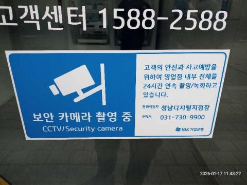 코너명: 성남디지털점 B1층(무인)작업일: 2026-01-17청소형태: 대청소회차: 1회차작업확인: 미확인전송: 완료전송메시지: {"resultCd":"1","resultMsg":"정상 처리 되었습니다."}사진수: 18마침시간: 1155