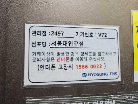 코너명: 서울대입구점작업일: 2026-01-17청소형태: 대청소회차: 2회차작업확인: 미확인전송: 완료전송메시지: SUCCESS_COUNT=(18), ERROR_COUNT=(0), RESULT_CODE=(0), RESULT_MESSAGE=(업로드 성공)사진수: 18시작시간: 0909마침시간: 0921