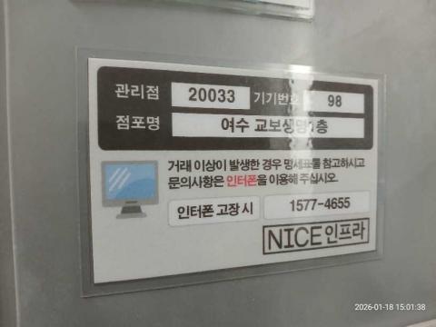 코너명: 여수 교보생명1층작업일: 2026-01-18청소형태: 대청소회차: 2회차작업확인: 미확인전송: 완료전송메시지: {"resultCd":"1","resultMsg":"정상 처리 되었습니다."}사진수: 17시작시간: 1501마침시간: 1512 2번 읽음