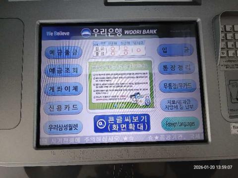 코너명: 전주대학교 스타타워 1층-WOORI작업일: 2026-01-20청소형태: 대청소회차: 1회차작업확인: 미확인전송: 대기사진수: 12시작시간: 1358마침시간: 1359 2번 읽음