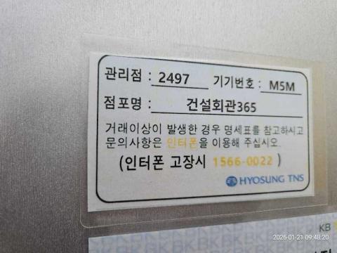 코너명: 건설회관 365자동화점작업일: 2026-01-21청소형태: 대청소회차: 1회차작업확인: 미확인전송: 완료전송메시지: SUCCESS_COUNT=(14), ERROR_COUNT=(0), RESULT_CODE=(0), RESULT_MESSAGE=(업로드 성공)사진수: 14시작시간: 0944마침시간: 0953