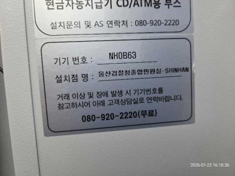 코너명: 울산검찰청종합민원실-SHINHAN작업일: 2026-01-23청소형태: 대청소회차: 1회차작업확인: 미확인전송: 대기사진수: 11시작시간: 1618마침시간: 1624 2번 읽음