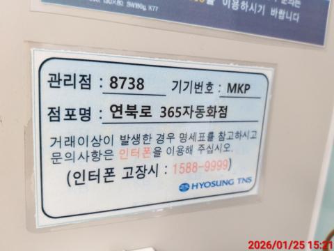 코너명: 연북로 365자동화점작업일: 2026-01-25청소형태: 대청소회차: 1회차작업확인: 미확인전송: 완료전송메시지: SUCCESS_COUNT=(13), ERROR_COUNT=(0), RESULT_CODE=(0), RESULT_MESSAGE=(업로드 성공)사진수: 13마침시간: 1701