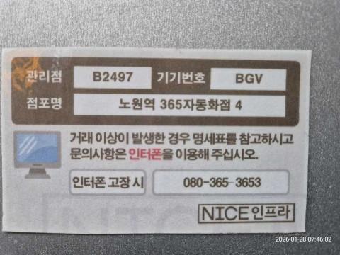 코너명: 노원역 365자동화점작업일: 2026-01-28청소형태: 대청소회차: 1회차작업확인: 미확인전송: 완료전송메시지: {"resultCd":"1","resultMsg":"정상 처리 되었습니다."}사진수: 18시작시간: 0746마침시간: 0801 1번 읽음