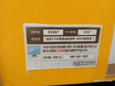코너명: 구리종합금융센터 365자동화점작업일: 2026-02-01청소형태: 대청소회차: 1회차작업확인: 미확인전송: 완료전송메시지: {"resultCd":"1","resultMsg":"정상 처리 되었습니다."}사진수: 18시작시간: 1155마침시간: 1200