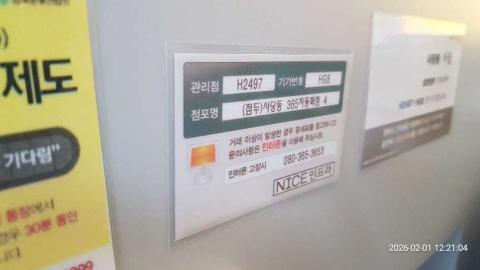 코너명: 사당동 365자동화점작업일: 2026-02-01청소형태: 대청소회차: 1회차작업확인: 미확인전송: 완료전송메시지: {"resultCd":"1","resultMsg":"정상 처리 되었습니다."}사진수: 19시작시간: 1221마침시간: 1227 1번 읽음