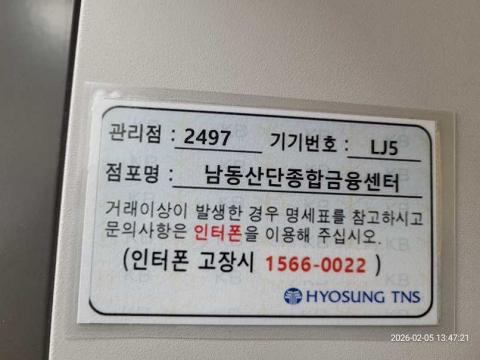 코너명: (목)남동산단종합금융센터 365자동화점작업일: 2026-02-05청소형태: (목)입점회차: 1회차작업확인: 미확인전송: 대기사진수: 5시작시간: 1347마침시간: 1352 5번 읽음