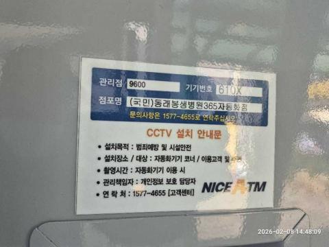 코너명: (국민)동래봉생병원365자동화점작업일: 2026-02-08청소형태: 간이청소회차: 1회차작업확인: 미확인전송: 대기사진수: 4시작시간: 1435마침시간: 1448 4번 읽음