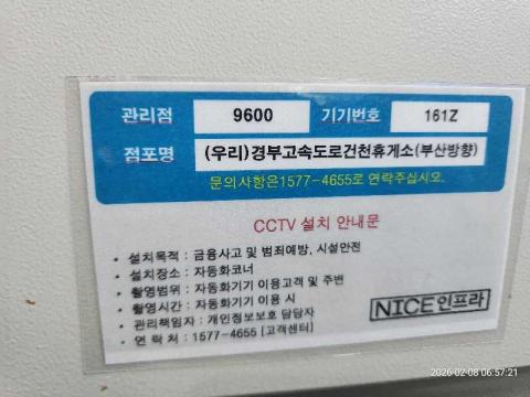 코너명: (우리)경부고속도로건천휴게소(부산방향)작업일: 2026-02-08청소형태: 간이청소회차: 1회차작업확인: 미확인전송: 대기사진수: 3시작시간: 0657마침시간: 0657 4번 읽음