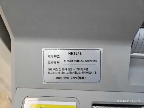 코너명: 어진마을한화6단지-SHINHAN작업일: 2026-02-11청소형태: 간이청소회차: 1회차작업확인: 미확인전송: 대기사진수: 3시작시간: 1438마침시간: 1441 5번 읽음