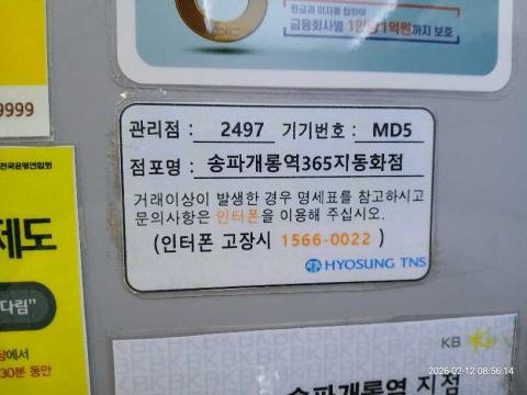 코너명: (목)송파개롱역 365자동화점작업일: 2026-02-12청소형태: (목)입점회차: 1회차작업확인: 미확인전송: 대기사진수: 4시작시간: 0856마침시간: 0902 4번 읽음