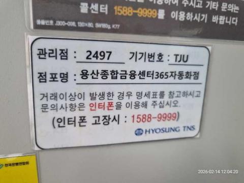 코너명: (목)용산종합금융센터 365자동화점작업일: 2026-02-14청소형태: (목)입점회차: 1회차작업확인: 미확인전송: 대기사진수: 4시작시간: 1204마침시간: 1210 3번 읽음