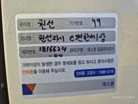 코너명: 수원권선자이 이편한세상 아파트 입구작업일: 2026-02-15청소형태: 간이청소회차: 3회차작업확인: 미확인전송: 대기사진수: 4시작시간: 1108마침시간: 1109 3번 읽음