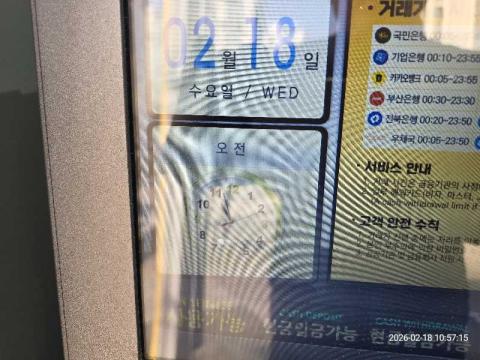 코너명: 도담동주민센터365자동화점-KB작업일: 2026-02-18청소형태: 간이청소회차: 1회차작업확인: 미확인전송: 대기사진수: 3시작시간: 1056마침시간: 1100 5번 읽음